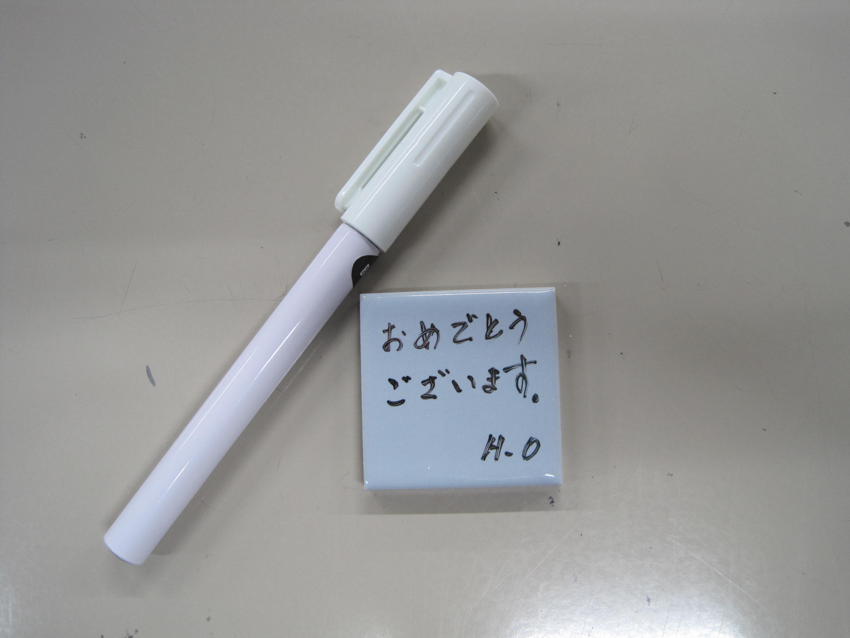 焼物用のペンで文字を書き、すぐに窯に入れて焼き入れ。
